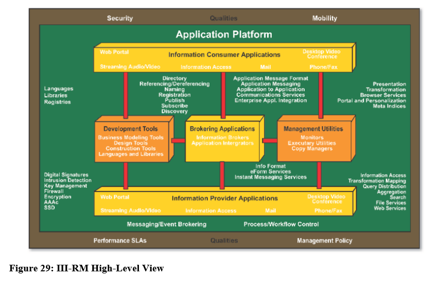 The Integrated Information Infrastructure Reference Model: The III-RM is a reference model that focuses on the Application Software space, and is a “Common Systems Architecture” in Enterprise Continuum terms. The III-RM is a subset of the TOGAF TRM in terms of its overall scope, but it also expands certain parts of the TRM – in particular, the business applications and infrastructure applications parts – in order to provide help in addressing one of the key challenges facing the enterprise architect today: the need to design an integrated information infrastructure to enable Boundaryless Information Flow.